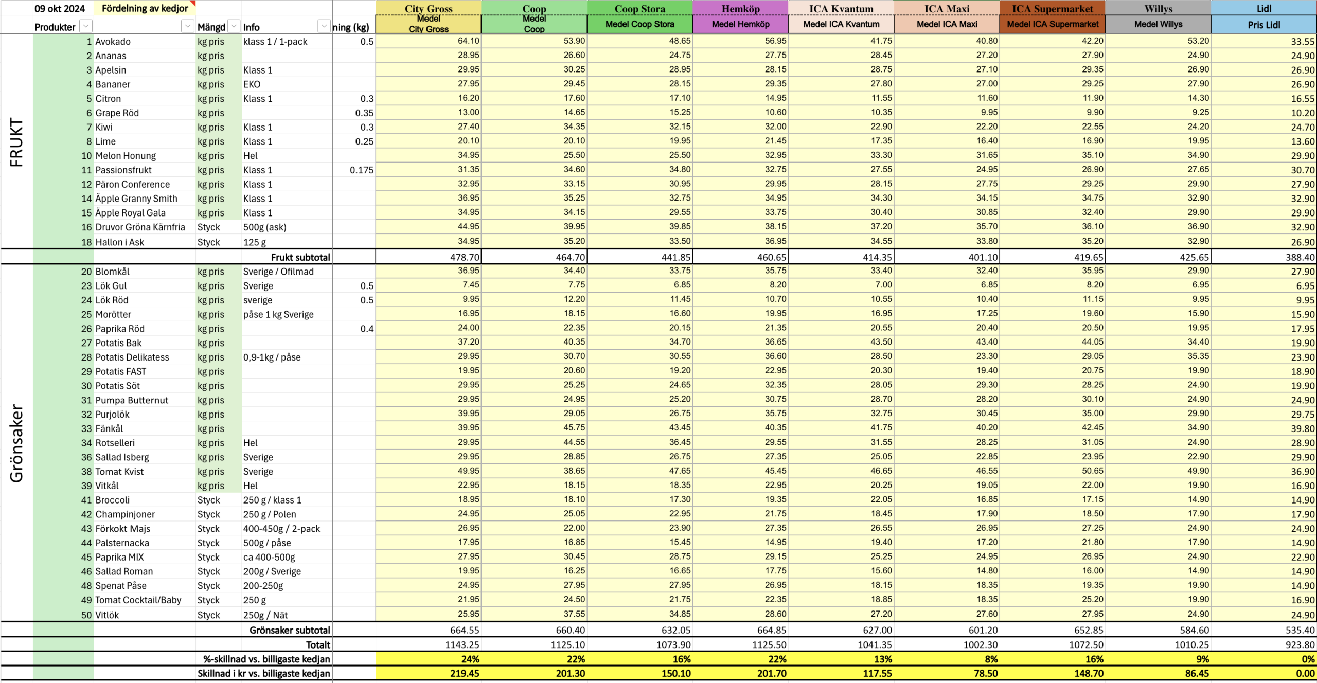 Matpriskollens stora prisjämförelse på frukt och grönsaker, 9 oktober 2024