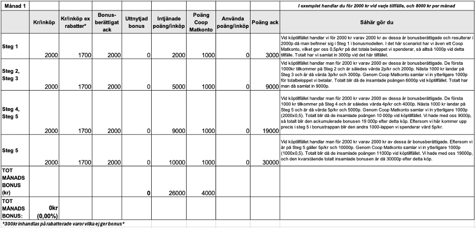 I vårt exempel (handla för 8000kr i månaden) blir det 0,5% i bonus varje månad samt gratisprodukter. Köper man för strax över 3000 kronor per månad blir bonusen procentuellt större och landar på ca.1,3%.