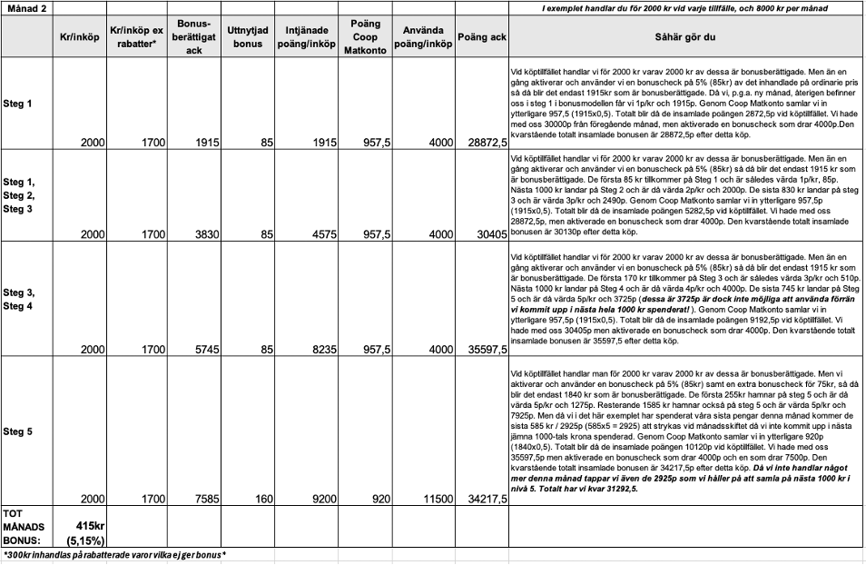 Om vi följer Matpriskollens exempel som tidigare med att man handlar för 8000kr i månaden kommer man i slutet av månad 2 upp på förmånssteg 4, där man sedan får 50 kr i bonus för varje 2500 kr man handlar för, eller 2%.
