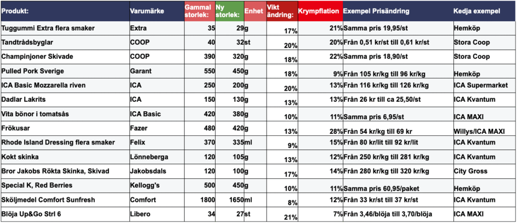 Matpriskollen har visat att Krympflation finns inom en mängd produktkategorier och både från kedjornas egna märken och leverantörer.