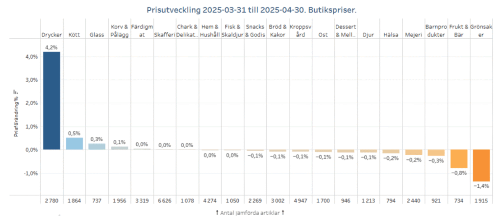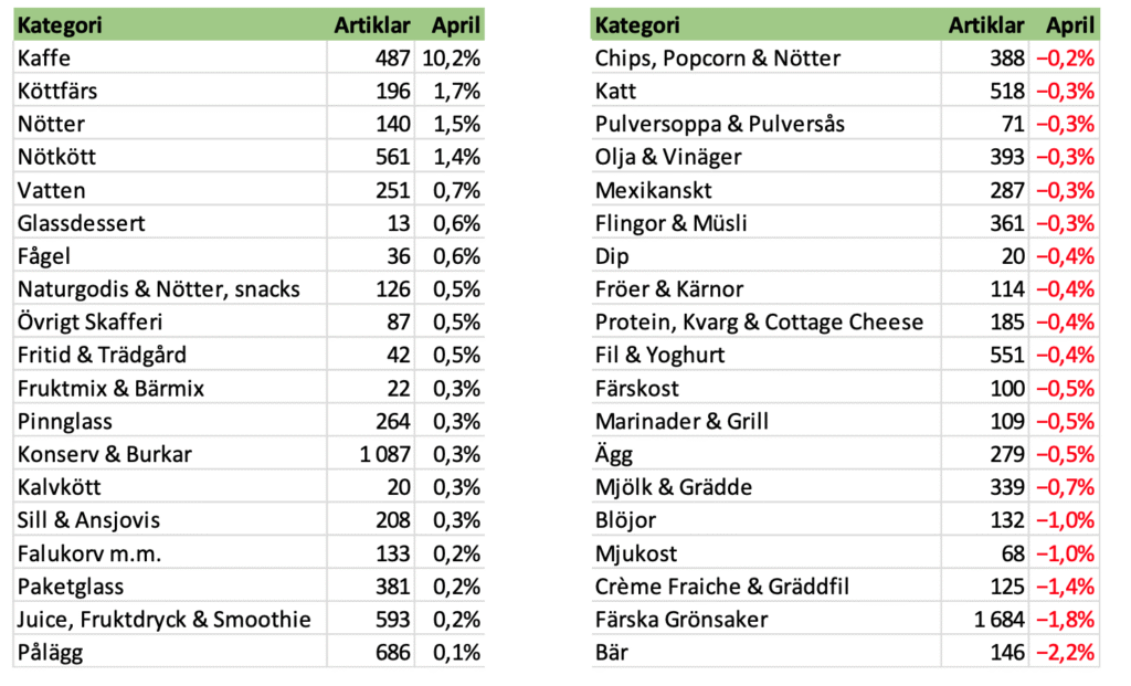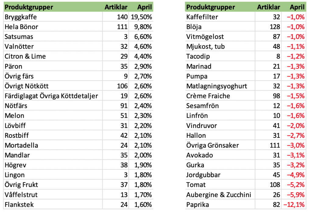 I april höjdes priserna mest på varukategorierna Bryggkaffe +20%, Köttfärs +1,7%, Nötter +1,5%, Nötkött +1,4% och Vatten +0,7%
