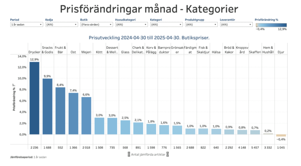 | 12 månader | +2,8% | (+4,0% mat) 36.018 artiklar | EMV +2,6% (9.762 art) |
