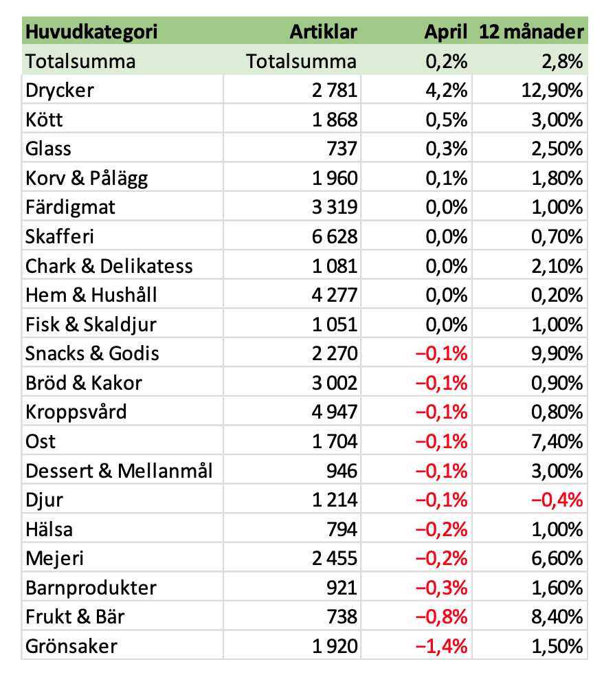 | April | +0,2% | (+0,4% mat) 44.613 artiklar | EMV +0,1% (11.912 art) |