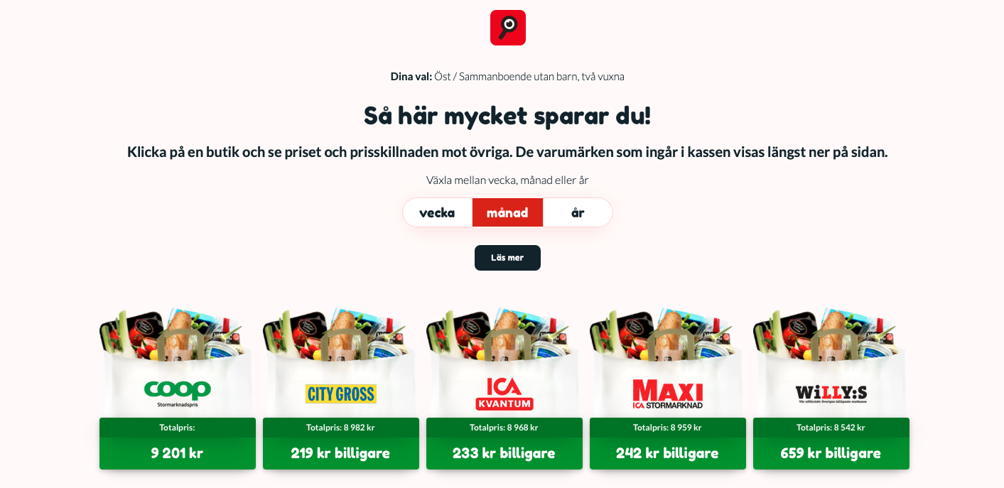 Undersökningen har jämfört priser på City Gross, ICA Maxi, ICA Kvantum, Stora Coop och Willys. I undersökningen ser du enkelt den beräknade prisskillnaden för olika hushållstyper i olika delar av landet. Undersökningen är unik i sitt slag och omfattar 219 produkter, där värdet är viktat utifrån försäljningsvolym per produktkategori. Medlemsbonusar, seniorrabatter, kampanjpriser mm, är inte med, vilka givetvis kan minska prisskillnaden mellan butiker.