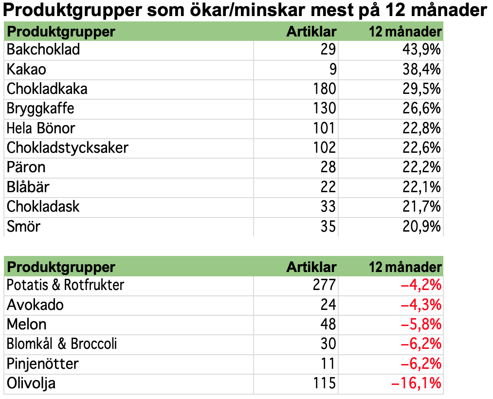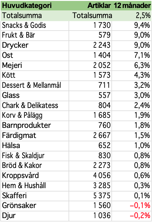| 12 månader | +2,5% | (+3,5% mat) 35.832 artiklar | EMV +2,3% (9.846 art) |