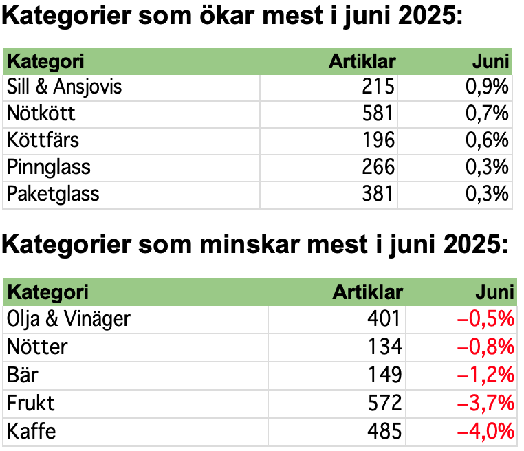Kategorier som ökat/minskat mest senaste året: (30 juni 2025 mot 30 juni 2024)