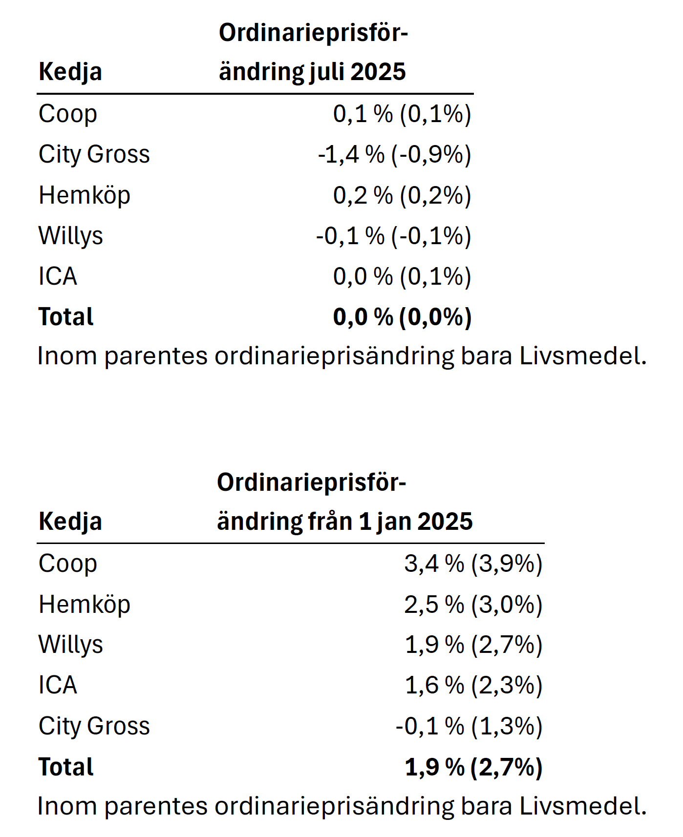 Under juli så ökade Coop sina priser mest, medan det i augusti var väldigt små skillnader mellan kedjornas förändringar av ordinariepriserna: Hemköp +0,2%, ICA +0,1% Coop och Willys -0,1%, medan CityGross sänkte priserna med hela –1,4%! Trots årets inledning med stora prisökningar, så ligger CityGross ordinariepriser stilla hittills i år, medan Stora Coops priser är cirka 3,4% högre och ICA MAXIs ca 1,6% högre än i början på 2025.