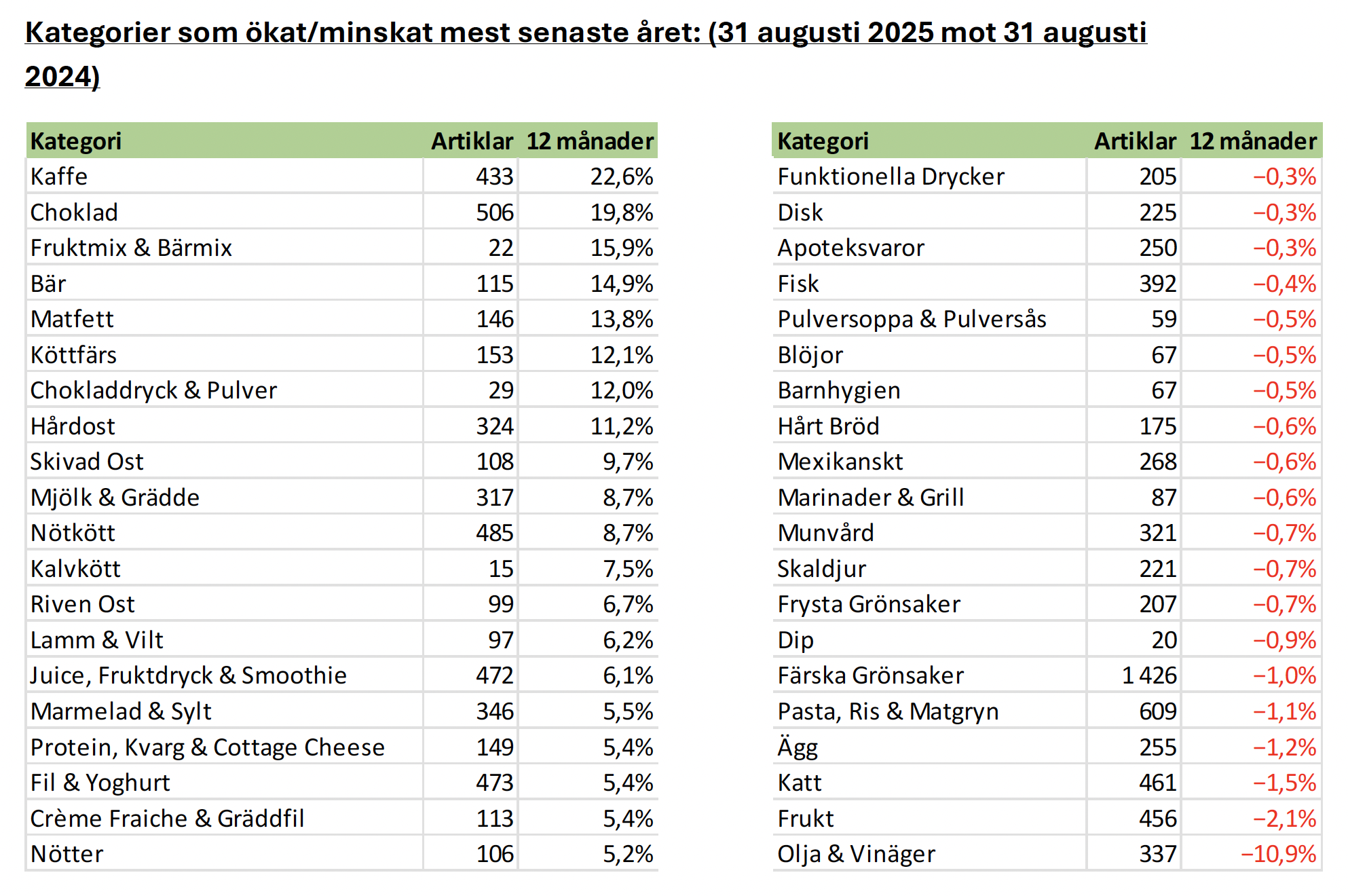 Kaffe +1,9%, drivet av snabbkaffe +4,6%, kapslar och hela bönor. Bryggkaffe förväntade Matpriskollen en prissänkning, då råkaffepriset sjunkit rejält under sommaren, men ett tvärt kast uppåt på råkaffet i början på augusti verkar ha ställt till det för rosterierna som nu agerat väldigt olika. Detta syns mellan Arvid Nordqvist som sänkte med 6 kr/paket och Zoeas (Nestlé) höjde med 3 kr/paket på Willys. En ökad skillnad på 18 kr/kg.