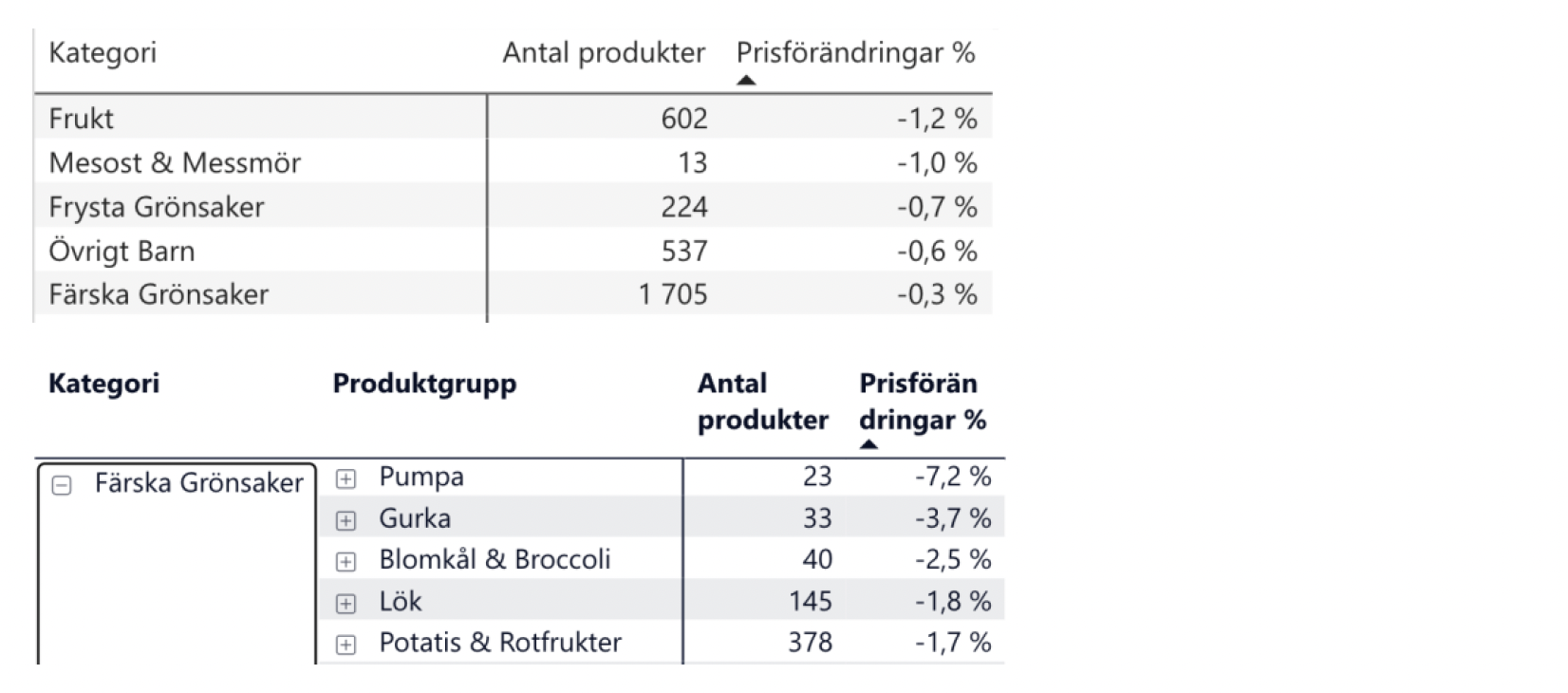 Mest prishöjda/sänkta kategorierna senaste 12 månaderna:
