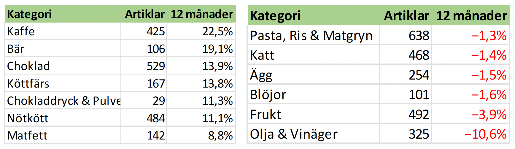 | 12 månader | +2,2% | (+3,2% mat) 37.355 artiklar | EMV +1,9% (10.379 art) |