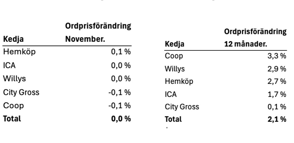 Priserna stod stilla, + - 0 procent, i november och på 12 månader är ökningen av ordinariepriserna +3,1 procent på livsmedel och +2,2 procent inkl alla varor i butikerna. Se tabell
