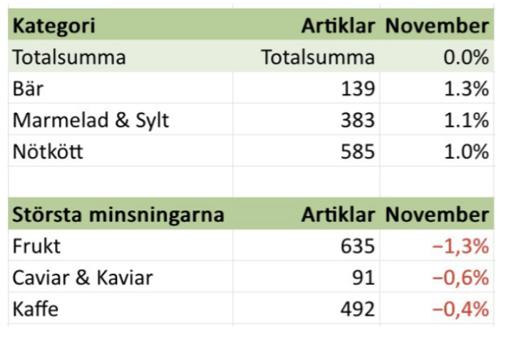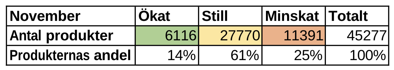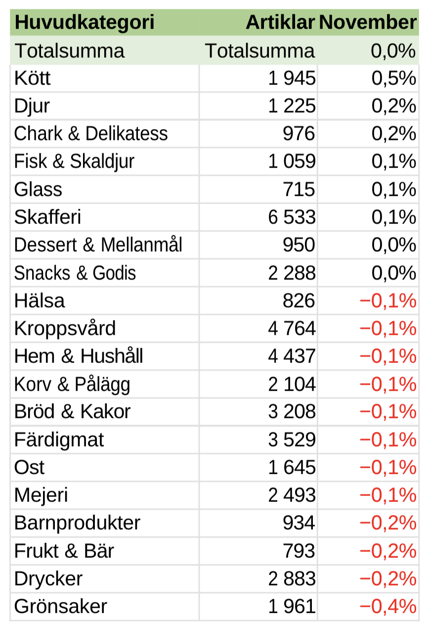 | November | +0,0% | (+0,0% mat) 45.277 artiklar EMV +0,0% (12.474 art) |