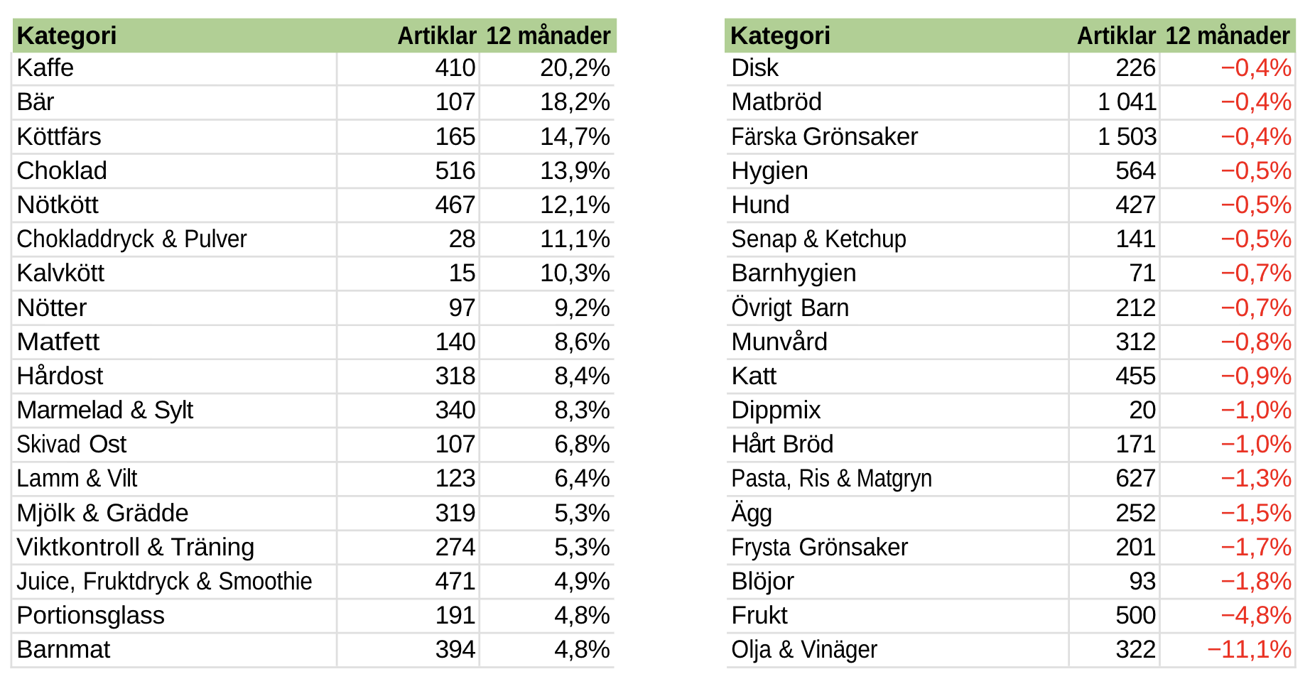 Top 5 varukategorier som ökat/minskat mest senaste 12 månaderna: